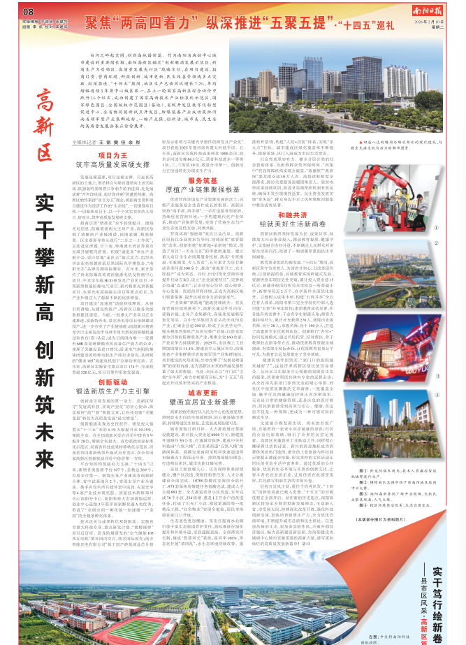 白河之畔起宏图,创新高地谱新篇。作为南阳省域副中心城市建设的重要增长极,南阳高新区锚定“创新驱动发展示范区、新质生产力引领区、高质量发展先行区”战略定位,在项目建设、招商引资、营商环境、科技创新、城市更新、民生改善等领域多点突破、纵深推进。“十四五”期间,地区生产总值同比增长7.2%,年均增幅连续5年居中心城区第一,在上一轮国家高新区综合评价中跃升16个位次,成功创建了国家高新技术产业标准化示范区、国家绿色园区、全国版权示范园区(基地)、省级开发区数字化转型促进中心、全省协同创新试点开发区,防爆装备产业成功获批河南省领军型产业集群地标,一幅产业强、创新活、城市美、民生安的高质量发展画卷正徐徐展开。